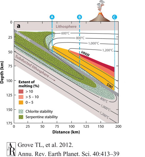 In Subduktionszonen wird kalte ozeanische Lithosphäre (Lithosphäre = Kruste + lithosphärischer Teil des obersten Mantels) sehr schnell in tiefere Bereiche des Erdmantels versenkt. Der krustale Anteil der ozeanischen Lithosphäre ist dabeirelativ kalt, maximal einige 100 Grad, weshalb das Temperaturfeld um die subduzierte Platte herum 'gestört' wird, es entwickelt sich entlang der Subduktionszone ein anormal niedriger Temperaturgradient, d.h es herrschen hohe Drücke bei vergleichsweise niedrigen Temperaturen. Das ist in der Abbildung unten dargestellt, achtet auf die Isothermen, das sind Linien gleicher Temperatur (im drei-dimensionalen Raum handelt es sich um Flächen). Die 'anormale' Temperaturverteilung in Subduktionszonen wird deutlich, wenn man in der Abbildung der blauen gestrichelten Linie B folgt. Man kann erkennen, dass diese Linie in einer Tiefe von ca. 25 km die 800°C Isotherme schneidet, in 25 km Tiefe herrschen also 800°C. Das entspricht einem in etwa 'normalen' Temperaturgradienten von ~32°C/km (sog. geothermischer Gradient). Geht man tiefer, nimmt die Temperatur erst einmal weiter zu, bis sie in einer Tiefe von ca. 50 km ein Maximum von etwas über 1200°C erreicht. Ab hier macht sich jetzt die 'Kühlwirkung' der kalten subduzierenden Platte bemerkbar, und mit zunehmender Tiefe wird es wieder 'kälter'. Bis man in etwa 75 km Tiefe wieder 800°C erreicht. Geht man noch tiefer, erreicht man in ca. 85 km Tiefe ein Temperaturminimum von etwas weniger als 600°C, bevor die Temperatur wieder ansteigt. Dieses Temperaturminimum liegt bei einem Druck von etwa 2.6 GPa (26 kbar), und wenn man diesen Wert bei 600°C in ein Diagramm mit den metamorphen Faziesbereichen einträgt, liegt man im Eklogitfeld. Hier entsteht also Eklogit.