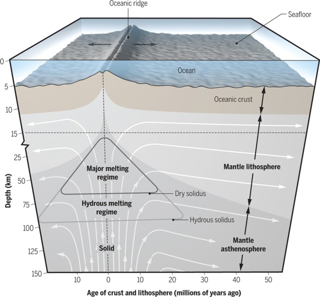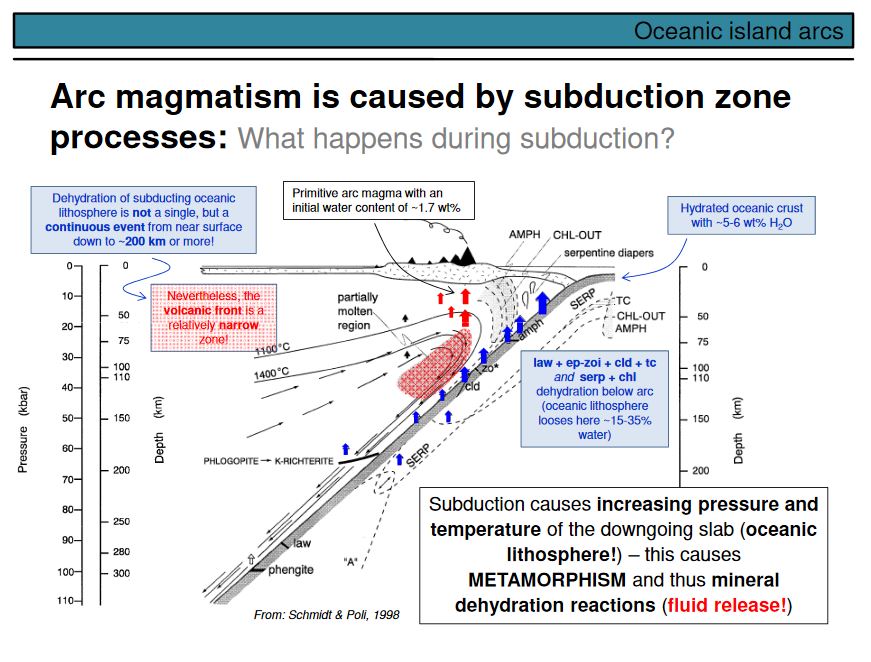 for details), rises upwards into the overlying mantle wedge to react with primary mantle phases and finally to cause partial melting. These primary melts rise upwards, fractionate en-route and in lithospheric and/or crustal magma chambers forming cumulate and intrusive magmatic rocks, and finally derivatives of them become erupted as island arc volcanic series. Note that primary arc magmas contain ~1.5-2.0 wt% of water, much more than primary MOR tholeiites, which are nominally dry (<0.3 wt%).