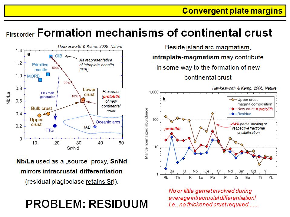 Beside island arc magmatism, either in intraoceanic settings or at active continental margins, intraplate magmatism may contribute to the formation of continental crust. Hawkesworth and Kemp (2006) provided a model in which oceanic island arc magmatism (with low Nb/La but high Sr/Nd) and intraplate magmatism (with high Nb/La and low Sr/Nd) both contribute to form the mafic precursor of the bulk continental crust. Mixing proportions based on these elemental ratios suggest ~92% island arc basalt and ~8% intraplate basalt (left figure, note that Nb is very low in the first, but very high in the latter, so it is again Nb that matters). Partial remelting of this mafic precursor produces the magma from which the continental crust develops. This remelting process lowers Sr/Nd in the 'crust' as Sr is compatible in plagioclase, and because plagioclase is stable in the residue during remelting. This is an elegant model, and it explains why the Sr excess that is often observed in island arc magmas, is absent in the bulk continental crust. On the other hand, this model postulates ~14% remelting of the mafic precursor to form the continental crust, and one needs to explain where the residual 86% of this plag-rich material are.