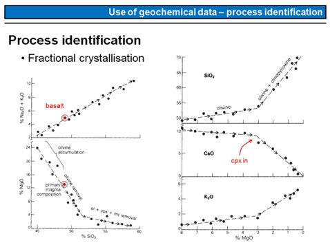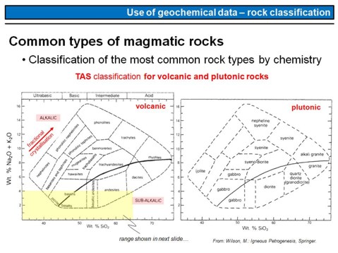 Until now, we have seen what schemes are used to name rocks based on their major element oxide composition. We will now see how major and trace-element compositions can be used to decipher specific magmatic processes (for those who have participated the lecture on "Trace elements in Magmatic Systems" think about how the Ni-content of a basaltic rock can provide information about whether olivine was removed from the magma or not prior to eruption and crystallisation!).