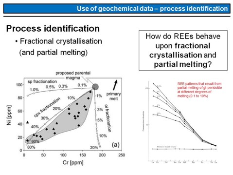 This is an example of how we can use trace-elements for process identification. The left diagram shows a series of basaltic rocks and their Cr and Ni contents. To be clear, each point in this diagram represents a single sample and its associated Ni and Cr content in ppm. This means, to produce this plot, 22 samples have been taken from different outcrops in the field, and each sample has been analyzed. What we see is a broad correlation between the Cr and Ni concentration in this sample series. Note the lines with the samll circles and the numbers. These lines are fractionation trajectories, this means they show how the Cr and Ni content in a magma changes if specific phases crystallize. We have three lines, one for olivine crystallisation (ol), one for clinopyroxene crystallisation (cpx), and one for spinel crystallisation (sp). Note that the term "fractionation" here means "fractional crystallisation".