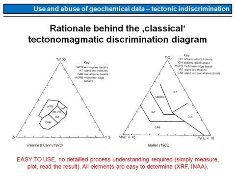 The invention of the afore mentioned 'discrimination diagrams' was early in the 1970s and 1980s, when only a limited number of geochemical data was available because of the limited availability of technical equipment. This changed during the late 1990s and in the 2000s, and the more high-quality geochemical data became available the more it became clear, that these 'discrimination diagrams' are only of minor value. In 2015, a somewhat provocative publication emerged that was not the first, but one of the most comprehensive that tested these discrimination diagrams and termed them 'indiscrimination diagrams'. The major conclusion that was drawn is marked here in red, and in the following I will briefly summarize the major findings.