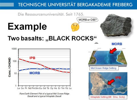 Imagin a basaltic rock found in an outcrop in the forest, about 200 million years (Ma) old. The question you may adress is about the origin of this basalt, 200 Ma ago, whether in a mid-ocean ridge environment (MORB = mid ocean ridge basalt), or in a intracontinental environment (IPB = intraplate basalt)? If you grind this basalt, to make a powder of it, you can perform geochemical analyses, and then you will know the chemical composition, this means the content of most of the chemical elements of the periodic table. If you select the rare-earth elements (REE), you can plot the abundance of each REE in a chondrite-normalized REE-diagram, with a logarithmic y-axis, and this is what is shown here in the lower left. As you can see, the REE patterns of basalts from MOR and IP settings differ significantly (MORB is depleted, IPB is enriched). To summarize, chemical analyses of rocks allow us to place constraints on the origin of these rocks.