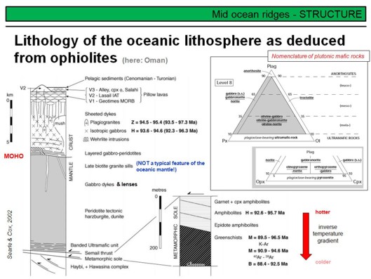 It is basically the oxygen and Sr isotope composition of water bearing minerals in oceanic gabbros, such as green hornblende and pargasite, that indicates that seawater infiltration into the oceanic crust via cracks and faults reaches the base of the crust and temperatures of up to ~975°C (!). This data is shown on the lower right and although scattered, there is a clear mixing correlation from the composition of MORB mantle (that equals primary basalts) towards the composition of seawater. A model that visualizes the inferred process of establishing a thermally driven hydrothermal circulation system is shown on the upper right, and on the basis of mineral parageneses observed in the crustal section of the Oman ophiolite the authors distinguished between low-temperature (LT), high-temperature (HT) and very-high temperature (VHT) hydrothemal systems, i.e. seawater circulation within the newly formed oceanic crust occurs within different depth levels.