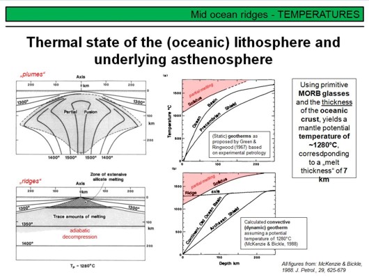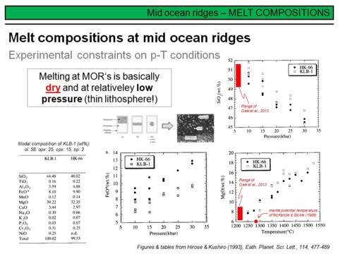 How do the observed MORB compositions from 'real' samples coincide with the composition of melts from melting experiments? This is outlined here. Note that the melts erupted at mid-ocean ridges are 'accumulated fractional melts', this means that their composition is a mixture of individual melt fractions that have formed over a considerable range of pressure during decompression melting (in the melting 'column'). Even more, these 'aggregate' or 'accumulate' melts delivered from the mantle might have undergone differentiation processes such as fractional crystallisation in the crust prior to eruption. In any case, MORB samples do not provide any information about compositional variations that are relate to different melting depths (pressures). This information, however, can be obtained from melting experiments. A common peridotite that has been frequently used for partial melting experiments is KLB-1 (a peridotite xenolith from the Kilborne Hole Crater in New Mexico). Its modal mineralogy is given in the header of the table on the lower left, along with its major element composition and that of another peridotite used in experiments, HK-66. The diagrams display some of the results of these melting experiments, where melt compositions are plottet against pressure and temperature of melting. Note that these melting experiments have been conducted under dry conditions, that means without adding water to the peridotite prior to melting. As you will see later, adding fluids such as water or CO2 (in form of CaCO3) to peridotite prior to melting makes a huge difference on p and T where melting starts and also strongly affects the composition of partial mantle melts. Two major conclusions can be derived from the melting experiments. The first is that the MgO-content of a basaltic melt increases with melting temperature (and thus, at a given depth range of melting, with increasing degree of melting). This is shown on the lower right. Note that the average MgO-content of ~10.5 wt% MgO in primitive MORB as derived by Presnall at al. coincides well with the mantle potential temperature of McKenzie & Bickle, which transforms to a melting temperature in the range of 1300-1330°C in depth. The second important observation is that the SiO2-content of a basaltic melt is a function of pressure, where at higher melting pressures the SiO2-content will be lower (see the upper right figure). This is the reason, along with the degree of melting, that continental intraplate basalts are typically lower in SiO2 than MOR basalts (because they form in greater depths). To summarize some other experimental findings is subject to the next