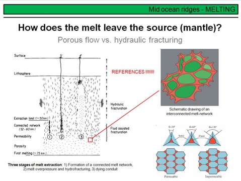 To summarize, all igneous crustal rocks observed in the oceanic crust, i.e. gabbros, gabbronorites, norites, pyroxenites, wehrlites, hornblende-gabbros, hornblende-gabbronorites, plagiogranites, microgabbros and basalts were derived from primary basaltic magmas by fractional cristallisation. Variables that control which rock type forms are basically the pressure of crystallisation and the water content of the magma, but remelting of juvenile hot oceanic crust due to seawater infiltration also is important in the formation of opx- and amph-bearing lithologies as well as plagiogranites. Wehrlites might be either basaltic intrusions that drag large amounts of mantle olivine, or cumulate rocks that require elevated pressure or water saturation during crystallization.