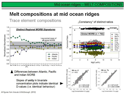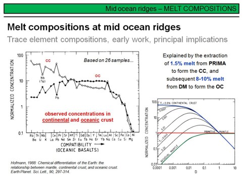 What about the trace element composition of MOR basalts? And what conclusions can be drawn from it regarding the chemical differeniation of our planet? Consider in this context that MOR basalts sample a very large terrestrial reservoir, namely the upper part of the asthenospheric mantle!! Also note, that MORB is here considered as being representative of the oceanic crust.