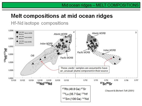 Watching the diagrams you can see that, as for Sr, Nd and Pb-isotope systematics, the Indian ocean MORB is broadly similar to Atlantic and Pacific MORB, but that a few samples extent to unradiogenic Nd-Hf values. These samples, three in this case, have correspondingly radiogenic Sr isotope compositions and are thought to reflect the presence of an enriched plume mantle component in their source.
