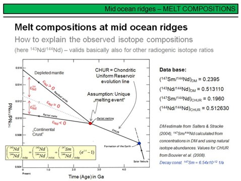 A system, this is a rock or a mineral or a melt or anything else, always becomes more radiogenic over time, never less radiogenic. Simply because radioactive decay is irrevesible and only happens in one direction! Therefore, whether something is 'radiogenic' or 'unradiogenic' rather means that something is 'more radiogenic' or 'less radiogenic'. Watch the diagram. The Earth formed from the solar nebula ~4.56 Ga ago, this is the blue point. The chemical composition of the Earth after formation is assumed to be chondritic (whatever this means!), and is termed here CHUR (chondritic uniform reservoir). Clearly this is a model composition but something we can calculate with! The CHUR and DM compositions in terms of Sm/144Nd and 143Nd/144Nd are given on the right. CHUR develops with time to a more radiogenic 143Nd/144Nd isotope composition, the slope of the 'evolution line' is determined by the Sm/Nd ratio (this is equal to the 147Sm/144Nd which results from the present day isotope abundances of Sm and Nd). The higher the Sm/Nd, the steeper the (negative) slope of this evolution linein the diagram on the overhead. The formula given in the lower left is the formula with which the isotope evolution lines have been calculated in this diagram. The only parameters required are the present day 143Nd/144Nd of a system (rock, mineral, reservoir,...), and its Sm/Nd ratio (or its 147Sm/144Nd ratio) defining the slope. Having these values, any isotope composition in the past can be calculated.