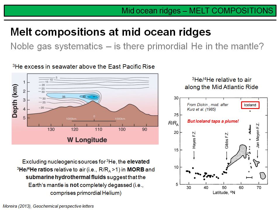 The figure on the right shows the He-isotopic composition of dredged MORB glases sampled along the Mid-Atlantic ridge from ~30°N to >70°N, and crossing Iceland. The Iceland samples are sub-glacial basaltic glasses. As you can see, there is an increase in excess 3He towards Iceland, with the highest values observed in Iceland samples with values exceeding 20-22 R/Ra. This strong 3He excess in some Icelandic samples is taken as indicative for the involvement of significant amounts of primordial (primitive mantle) material in the source of Icelandic basalts. Note, however, that Iceland is a setting where a deeper seated mantle plume intersects the Mid-Atlantic ridge, and hence Iceland is rather an OIB setting than a typical MORB setting. This is also the reason why Iceland is exposed subaerial.
