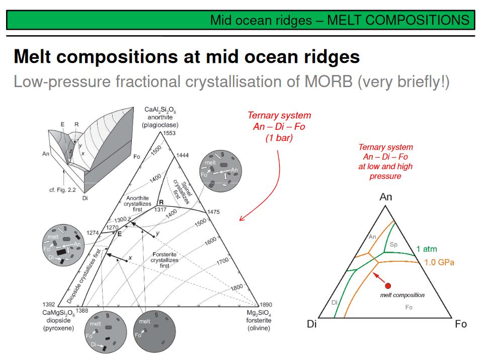 This overhead is basically a repetition of what you have learned elsewhere. It exemplary shows the differentiation of a basaltic, primary olivine-normative magma at low pressure (left). The common sequence of crystallisation along the liquid line of descent is ol -> ol + plag -> ol + plag + cpx at the ternary temperature minimum (starting from the composition marked with 'y'). At high Ca/Al ratios in the melt (point 'x'), the sequence of crystallisation will be ol -> ol + cpx -> ol + cpx + plag. The same is valid at higher pressures, which lead the stability range of cpx to increase at the expense of ol and plag. This is shown on the right, where the green lines represent the phase boundaries at ~1 bar, and the red lines at 1 GPa. Note that opx is not a common liquidus phase