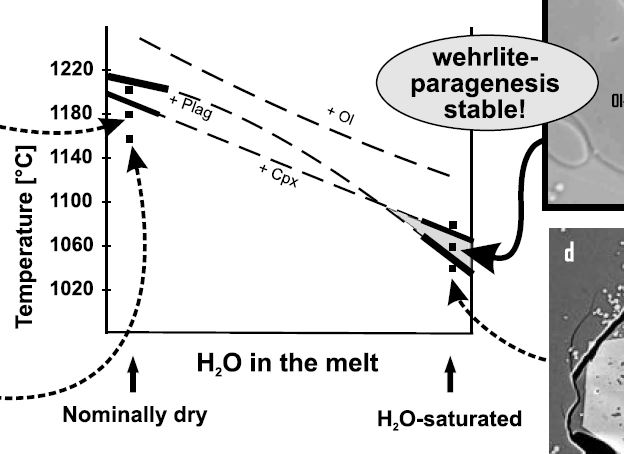 in dry basaltic magmas, but may become stable at higher water activities. Water saturation of basaltic magmas also supresses the crystallisation of plagioclase and can explain the formation of wehrlites (see figure on the right, from Koepke et al., 2009), although primary MORB is nominally dry. In island arc settings, by contrast, primary basalts are commonly water-rich, and thus may crystallize Ol and Cpx to form wehrlites instead of gabbros, assisted by higher pressures.