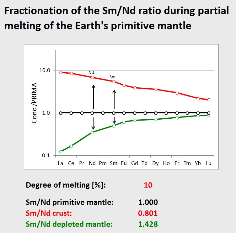 What about the residue, i.e. the depleted mantle that lost this melt? Its composition is shown as green curve in the second diagram.This residue is depleted in light-REE, and as Nd is more incompatible than Sm during mantle melting, the Nd concentration is lower than the Sm concentration. This means that the residue has a high Sm/Nd ratio of 1.428 in this case, and thus the depleted mantle will develop to a radiogenic Nd-isotope compositon over time.