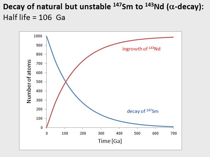 Now consider that any atom of 147Sm that decays ends up becoming a stable 143Nd isotope. So, as the abundance of 147Sm in rock or mineral decreases, the abundance of 143Nd in this rock or mineral increases at the same rate. This is the red curve in the diagram.